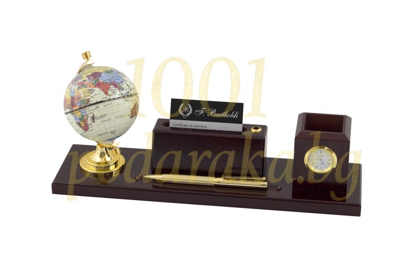 Дървена стойка с визитник, място за химикалка и вграден глобус.